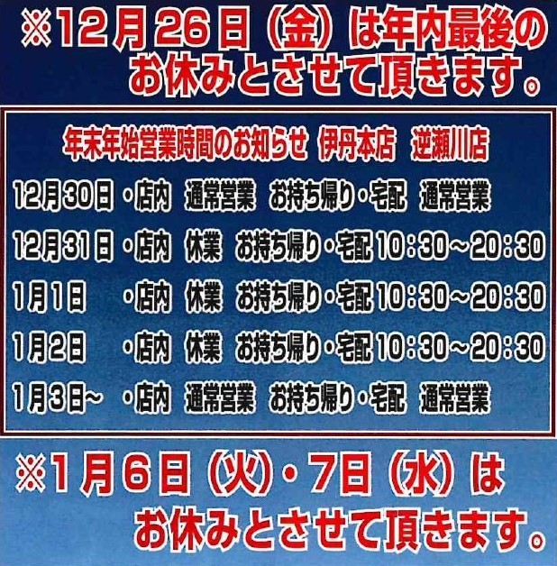 味のれんでは、本年度の年末年始営業時間を以下の日程で実施させていただきます。